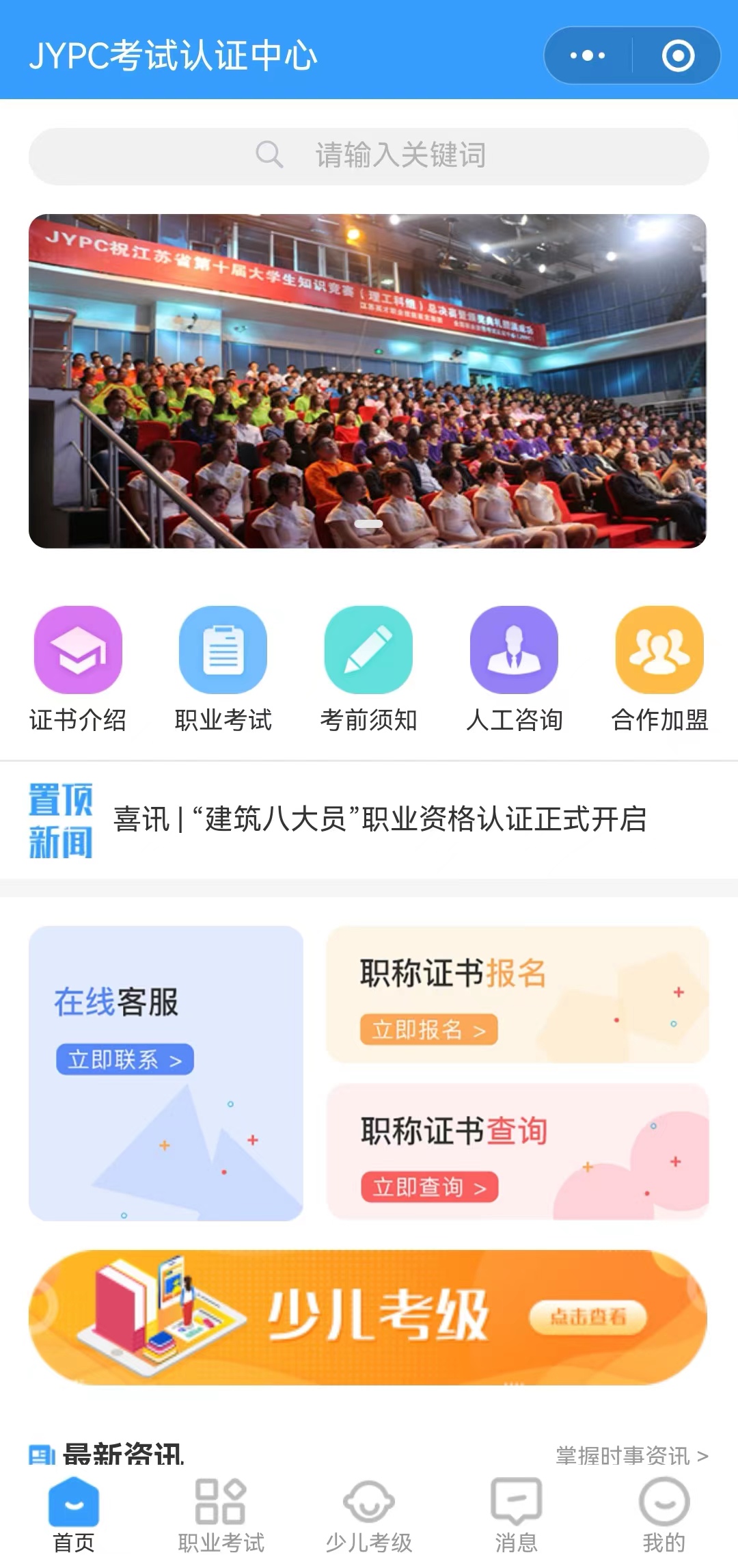 打开“JYPC考试认证中心”小程序,可在首页看到“两大类”“五大模块”。“两大类”即职称考试和少儿考级;“五大模块”指证书介绍、职业考试、考前须知、人工咨询、合作加盟。