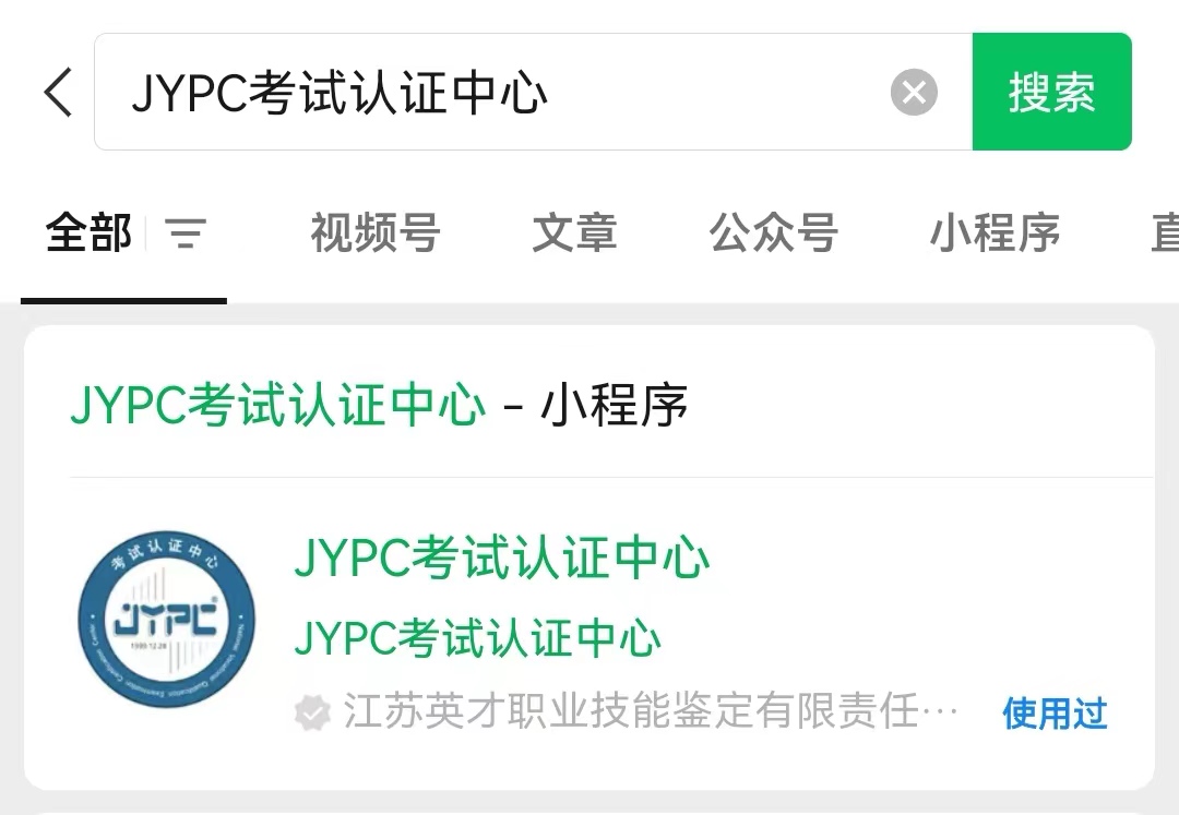 在微信搜索栏输入“JYPC考试认证中心”,点击搜索,即可找到“JYPC考试认证中心”小程序。